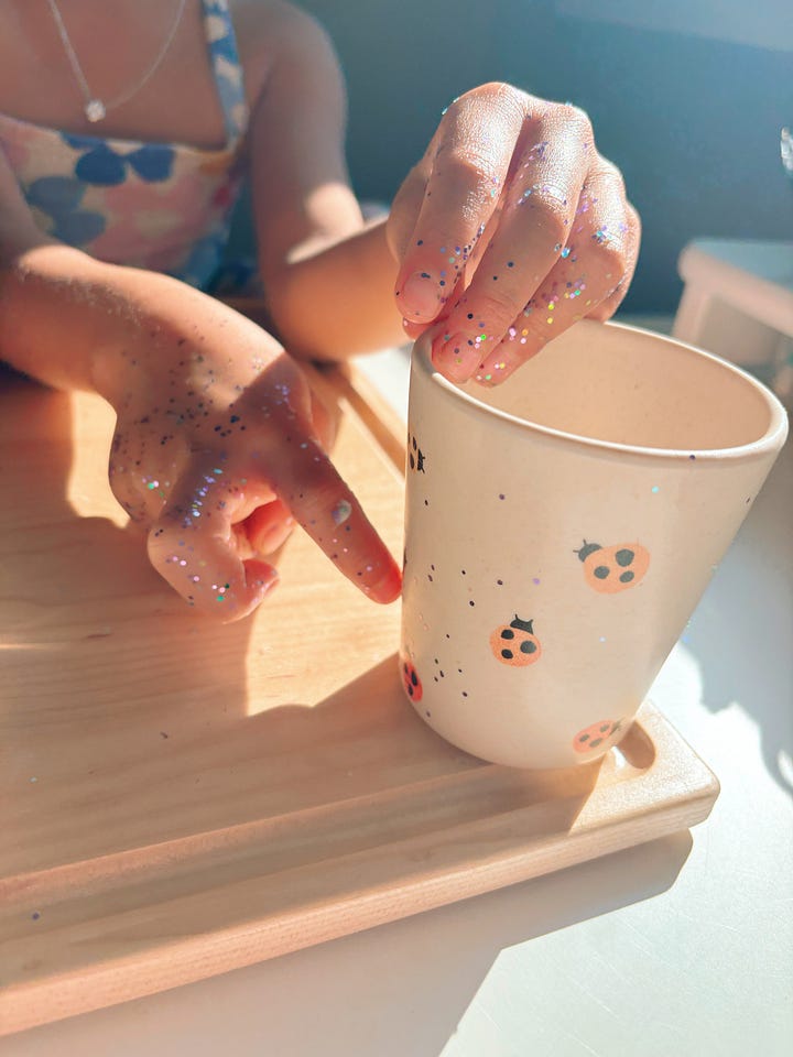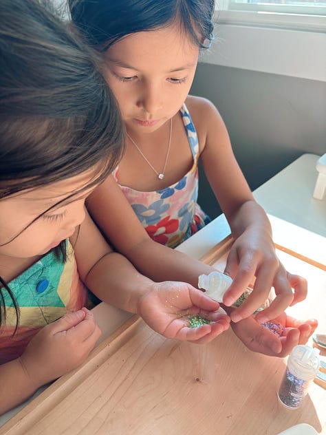 At one point, Piperās nose got a bit itchy. She scratched it without hesitation then immediately realized what she did! I set out a mirror so she could see how the glitter germs transferred to her nose highlighting how our own unwashed hands can spread germs to ourselves.